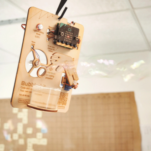 Das Set kann mit Hilfe eines micro:bit V2.2 für den Bau einer Seifenblasenmaschine verwendet werden und ermöglicht eine Einsicht in die Funktionsweise von Automaten.
